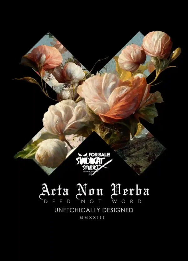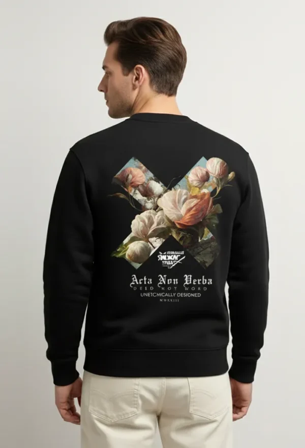 This “Acta Non Verba” sweatshirt brings together classical floral artwork and bold modern streetwear typography. Featuring rich, painterly blossoms set against a dark graphic layout, it delivers a premium aesthetic look. Soft fleece, comfortable fit, and perfect for art lovers, minimal streetwear fans, and anyone who wants a refined yet bold graphic piece.