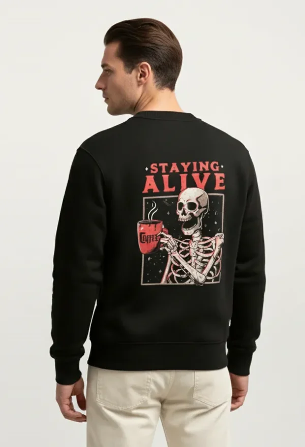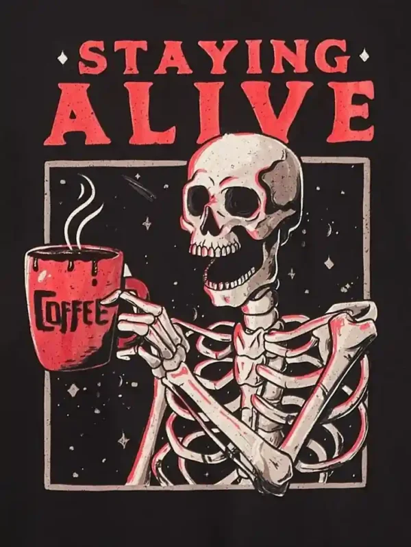Bring dark humor to your streetwear wardrobe with this “Staying Alive” skeleton coffee sweatshirt. Featuring a bold vintage-style graphic and premium soft fleece, it’s perfect for caffeine lovers, edgy fashion fans, and anyone who vibes with sarcastic, urban street aesthetics. Comfortable, stylish, and guaranteed to stand out.