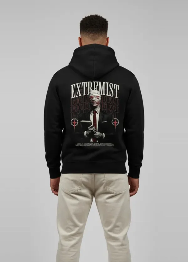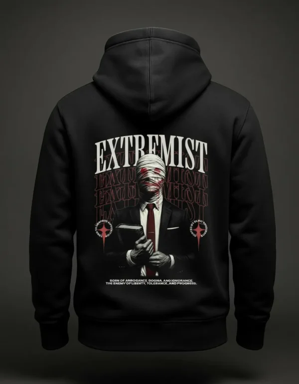 Make your statement with the Extremist Hoodie. Heavy-cotton blend, bold statement graphic, oversized fit tailored for Indian urban trendsetters and street style seekers.
