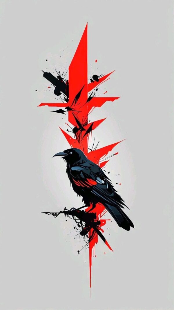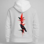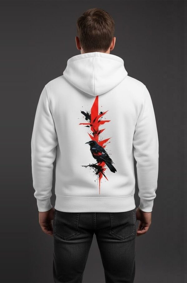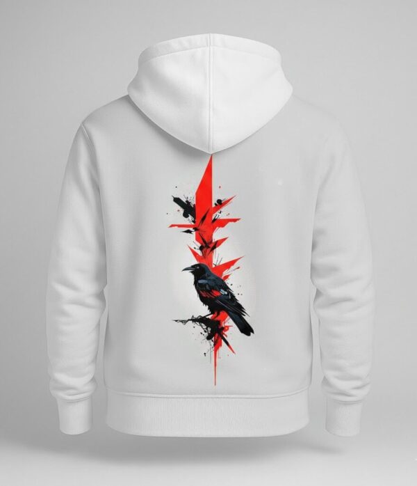The Raven Art Hoodie features a stunning black crow over a vivid red abstract stroke. A symbol of mystery and strength, crafted for urban fashion enthusiasts.